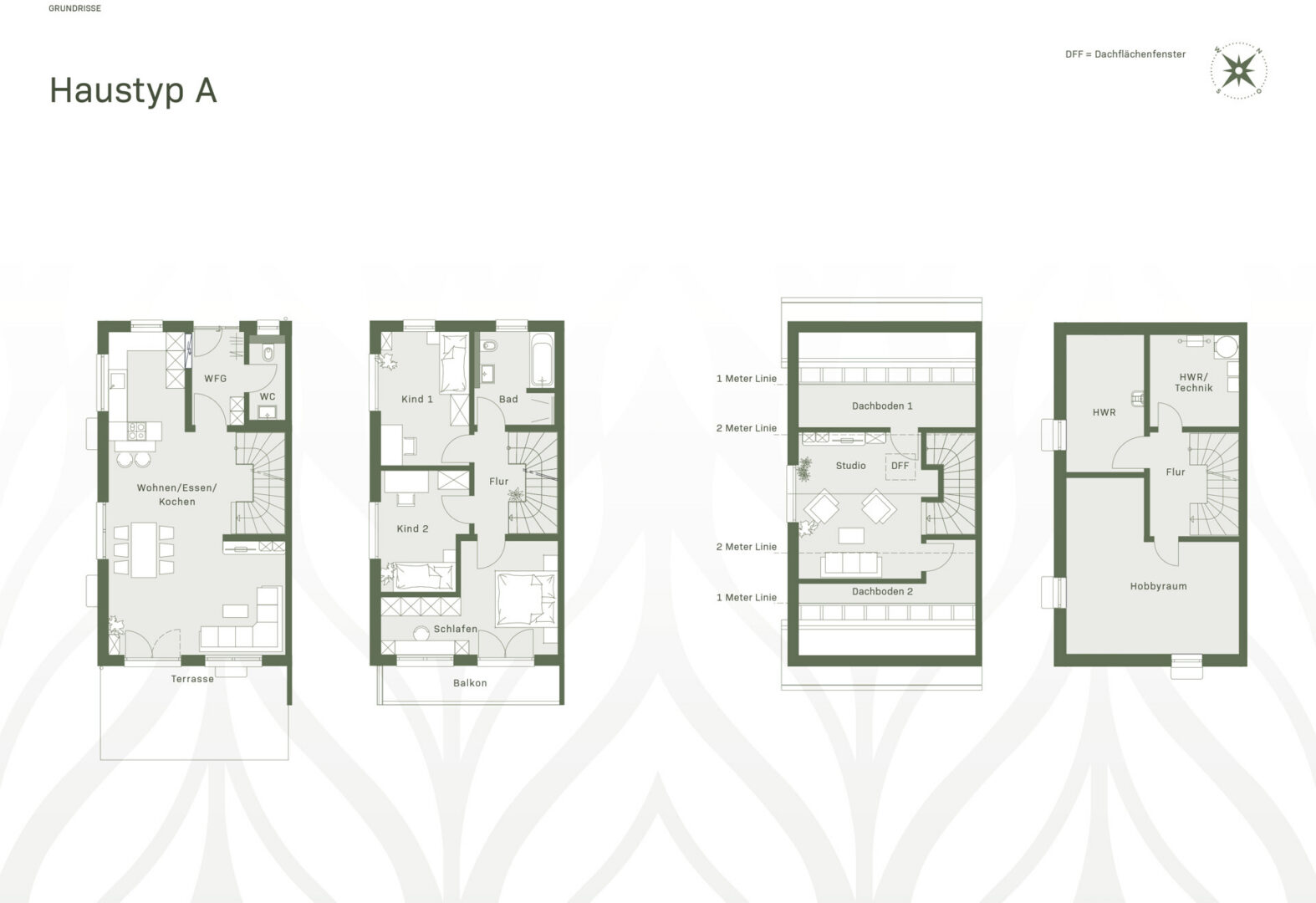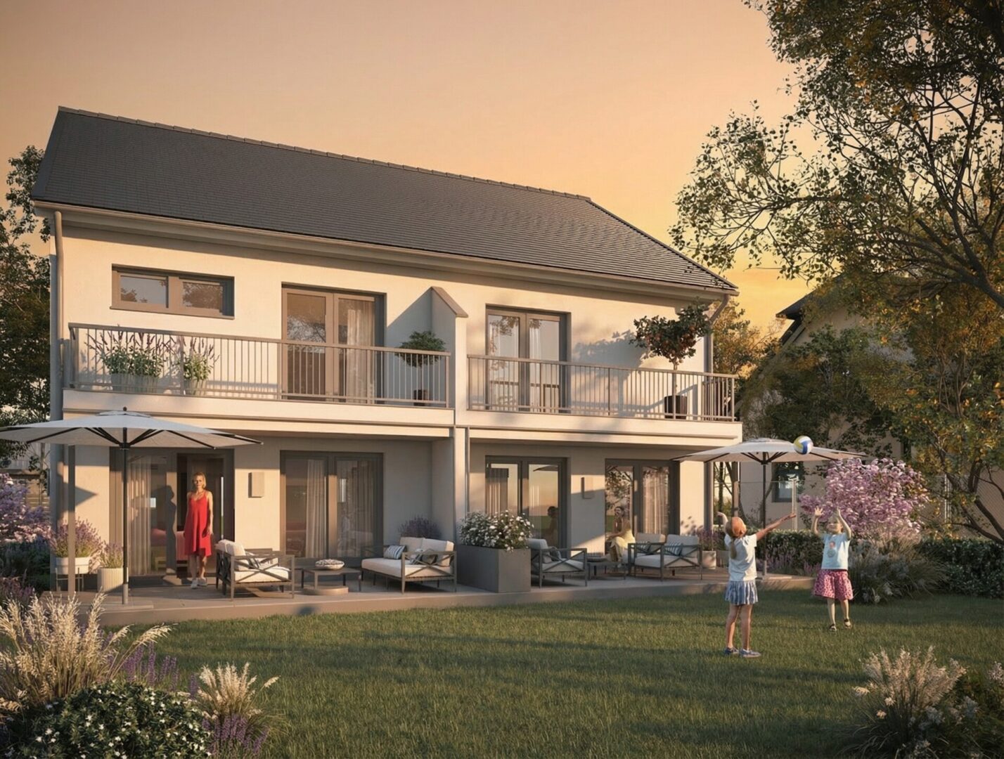 Hinter den attraktiven Fassaden, deren moderne Architektursprache einladende Anziehungskraft ausstrahlt, verbergen sich innere Werte: Der lichterfüllte Wohnbereich mit offener Küche, der sich zur Terrasse und zum langgestreckten großen Garten wendet. Schlaf- und Kinderzimmer mit großen, überwiegend bodentiefen Fenstern und teilweise Zugang zum Balkon. Das Dachstudio, voll ausgebaut ein großzügiger Rückzugsbereich mit zahllosen Möglichkeiten, z. B. für Gäste, das